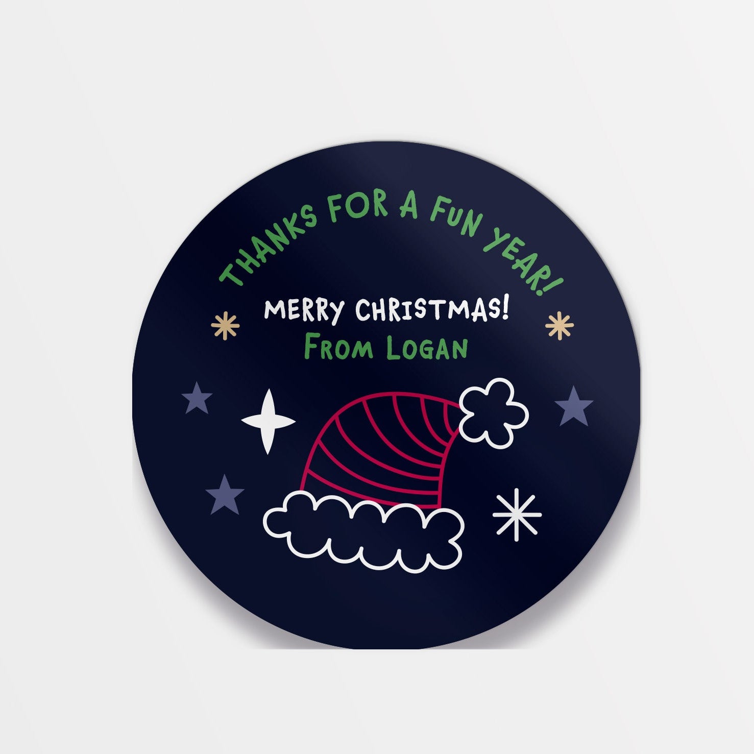 These festive navy-blue stickers, complete with a cute Santa hat, are perfect for gifting to classmates. Add your own message and skip the card altogether! Stick them on cookies, presents, gift bags, or anywhere you want to add a pop of holiday fun. Kids will love the playful design and the freedom to personalise each gift with their name and a fun Christmas touch.